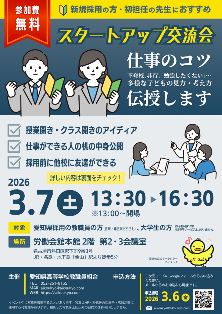 スタートアップ交流会2026 2026年1月17日/カテゴリ: お知らせ, 仲間と楽しく交流, 学習で力量アップ /作成者: LAF41475wm478スタートアップ交流会開催! 2026年3月7日(土)13時半~ 労働会館本館(金山駅より徒歩10分) チラシはこちら https://aikoukyo.com/wp-content/uploads/2025/01/カラー表スタートアップ交流会2026完成.jpg 2000 1414 LAF41475wm478 https://aikoukyo.com/wp-content/uploads/2020/02/logo-1.png LAF41475wm4782026-01-17 11:27:032026-01-24 09:40:40スタートアップ交流会2026
